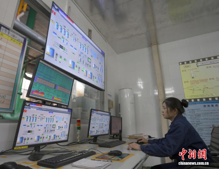 图为正在凤山糖厂造炼车间,工人掌握电脑检查消费环境。汤晓逵 摄
