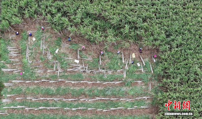 图为蔗农正在天里砍支苦蔗。(无人机像片) 汤晓逵 摄